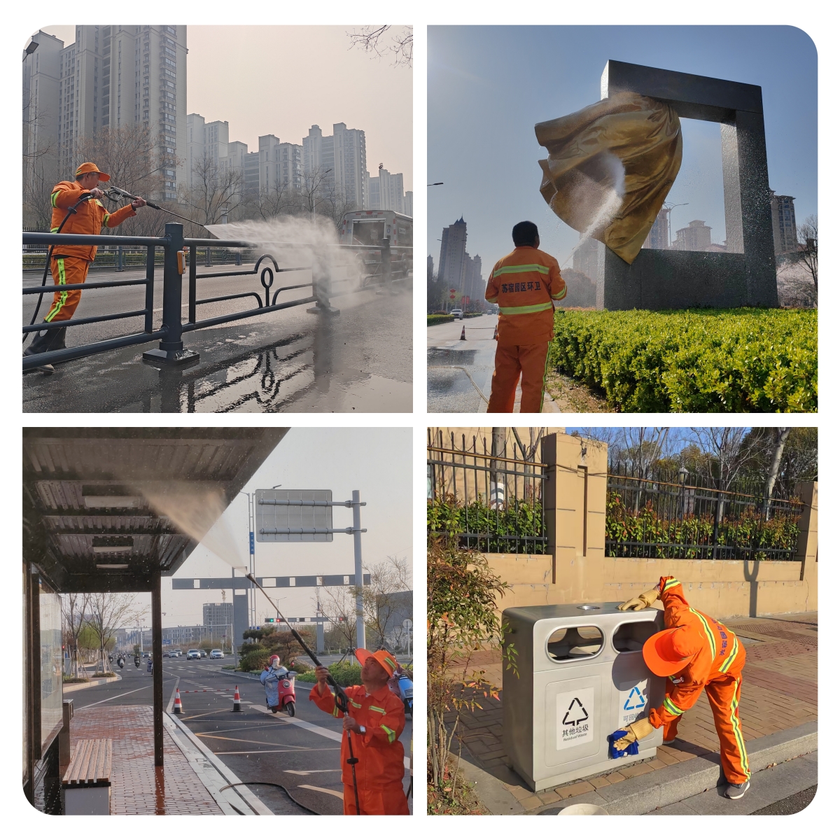 “立面”清洗,“洗”出“高顏值”。采用“擦、洗”相結(jié)合,對(duì)公交站臺(tái)、交通護(hù)欄、果殼箱、雕塑小品等城市家具進(jìn)行了深度清潔,在日常擦拭的基礎(chǔ)上,集中開展了一次設(shè)施“立面”大清洗,洗去冬日積塵,重現(xiàn)靚麗本色。