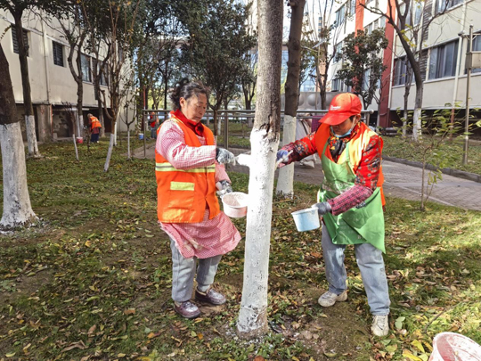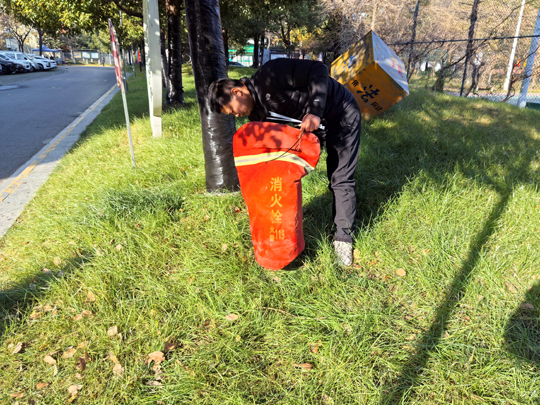 細(xì)心的業(yè)主不難發(fā)現(xiàn),樹木已悄然穿上整齊的“冬裝”。物業(yè)工作人員有條不紊地對(duì)喬木根部進(jìn)行涂白處理。這層白色“防護(hù)衣”不僅美觀,更是樹木越冬的“守護(hù)者”——它能有效反射部分陽(yáng)光,減緩樹干因晝夜溫差過大而導(dǎo)致的凍裂風(fēng)險(xiǎn),同時(shí)清除樹皮縫隙中潛藏的害蟲及蟲卵,為來(lái)年春季樹木茁壯成長(zhǎng)打下堅(jiān)實(shí)基礎(chǔ)。