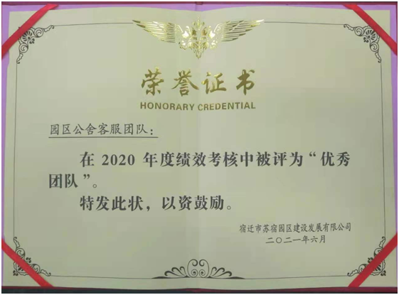近日,園區(qū)公舍客服條線在2020年建發(fā)公司績效考核中,榮獲“建發(fā)公司優(yōu)秀團隊”稱號。
