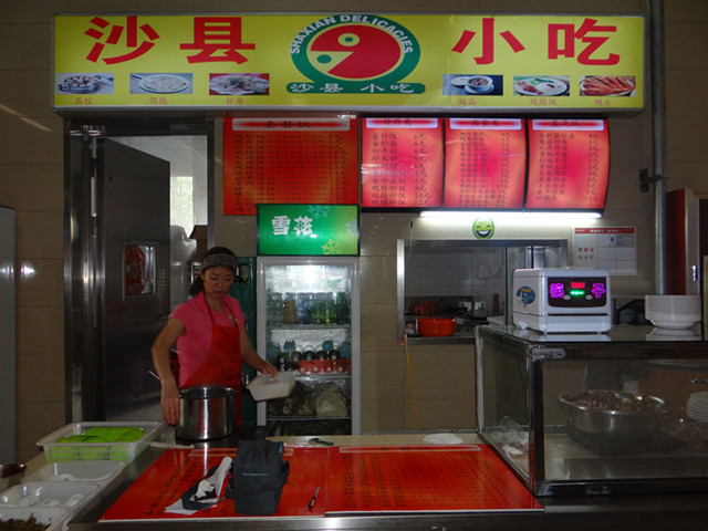 在墻上掛出的紅底黃字的大幅菜單上可以看到,沙縣小吃被分為小吃、燉品、面食、套飯四大類,30多個品種,價格大多在6元到10元之間,很少有超過10元。